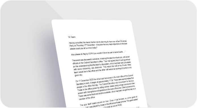 25 ³Hi Team, Having consulted the leave tracker Ze¶re planning to have our virtual Christmas Party on Thursday 17 th December ± if anyone has any major objections to that date please could you let us know today? Also please do flag b\ COP if \ou Zouldn¶t like to be part of secret santa«.. ́ The event was discussed in advance, including the idea of a virtual quiz , with senior officials in the Cabinet Secretary¶s office . They had agreed that it could go ahead on the understanding that the team¶s rota system, which had been set up to assist with social distancing, was observed. This meant that half of the Private Office team would be in the office and the other half would be wo rking at home on any given day. On 17 December 2020 the virtual quiz took place in the outer office of the Cabinet Secretary¶s room. It began at approximately 17 . 30. There were approximately five people in the office that day. The Cabinet Secretary was not present for the quiz. Those in the office joined by sitting at their desks using a large communal video screen with microphone and speakers in the outer office area. Others joined online. There was some food and alcohol available, which had been bought that day by a member of the office. The quiz itself lasted around an hour. Once it had finished, an online game of ³Articulate ́ was played by those in the office and those at home. This game lasted around half an hour. The event finish ed at around 19.00 . Once the game of ³Articulate ́ had finished, there was some informal chat for a brief period between those joining remotely and the group in the office. The virtual participants then logged off. Those who had been working in the office continued to chat. At 20.25 the Cabinet Secretary returned to his office from No 10 and remained working there. Before leaving the building at 21.45 he stopped to speak to members of his Private Office for about 15 minutes. He was offered and took a beer. His Private Offi ce team remained in the office chatting and finishing their drinks and snacks.