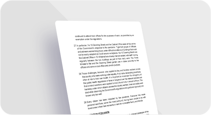 7 continued to attend t heir offices for the purposes of work, as permitted by an exemption under the regulations. 27. In particular, No 10 Downing Street and the Cabinet Office were at the centre of the Government¶s response to the pandemic. Tight knit groups of officials and advis ers worked long hours under difficult conditions in buildings that could not be easily adapted as Covid secure workplaces. No 10 Downing Street and the Cabinet Office in 70 Whitehall are closely interconnected, with staff moving regularly between the two b uildings as part of their daily work. The Prime Minister¶s flat and the Downing Street garden are in close proximity to the offices and serve a dual office and private purpose. 28. Those challenges, however, also applied to key and frontline workers across t he country who were working under equally, if not more, demanding conditions, often at risk to their own health. It is important to remember the stringency of the public health regulations in force in England over the relevant periods and that criminal san ctions were applied to many found to be in breach of them. The hardship under which citizens across the country worked, lived and sadly even died while observing the Government¶s regulations and guidance rigorously are known only too well. 29. Every citizen has been impacted by the pandemic. Everyone has made personal sacrifices, some the most profound, having been unable to be with loved ones in their last moments or care for vulnerable family and friends. Factual findings of the events 30. For each event, I have summarised the particularly relevant passages of the applicable regulations and Government guidance. As explained in my u pdate r eport, it is not my role to make a judgment on whether or not the criminal law has been broken; my focus has been on establ ishing the nature and purpose of the events and whether those events were appropriate in light of the Government¶s own guidance. Where I have set out the terms of the regulations, this is because they also formed part of the guidance. Other aspects of the guidance, particularly in relation to social distancing, w ere in addition to the terms of the regulations. 31. The numerical references attributed to roles are distinct for each event. 32. On the evidence collected, I have made the following findings: