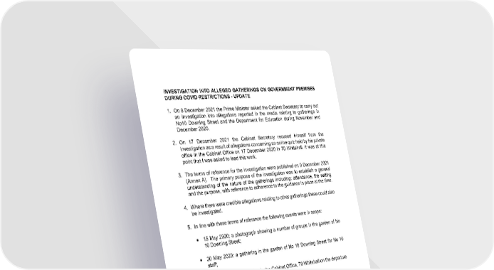 3 INVESTIGATION INTO ALLEGED GATHERINGS ON GOVERNMENT PREMISES DURING COVID RESTRICTIONS - UPDATE 1. On 8 December 2021 the Prime Minister asked the Cabinet Secretary to carry out an investigation into allegations reported in the media relating to gatherings in No10 Downing Street and the Department for Education during November and December 2020. 2. On 1 7 December 2021 the Cabinet Secretary recused himself from the investigation as a result of allegations concerning an online quiz held by his private office in the Cabinet Office on 17 December 2020 in 70 Whitehall. It was at this point that I was asked to lead this work. 3. The terms of reference for the investigation were published on 9 December 2021 ( Annex A ) . The primary purpose of the investigation was to establish a general understanding of the nature of the gatherings including: attendance, the settin g and the purpose, with reference to adherence to the guidance in place at the time. 4. Where there were credible allegations relating to other gatherings these could also be investigated. 5. In line with those terms of reference the following events were i n scope: • 15 May 2020; a photograph showing a number of groups in the garden of No 10 Downing Street; • 20 May 2020: a gathering in the garden of No 10 Downing Street for No 10 staff; • 18 June 2020: a gathering in the Cabinet Office , 70 Whitehall on the departure of a No 10 private secretary; • 19 June 2020: a gathering in the Cabinet room in No 10 Downing Street on the Prime Minister’s birthday; • 13 November 2020: o a gathering in the No 10 Downing Street flat; o a gathering in No 10 Downing Street on the departure of a special adviser; • 27 November 2020: a gathering in No 10 Downing Street on the departure of a special adviser; • 10 December 2020: a gathering in the De partment for Education ahead of the Christmas break; • 15 December 2020: a gathering in No 10 Downing Street for an online Christmas quiz ;