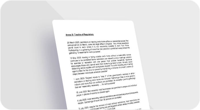 10 Annex B: Timeline of Regulations 26 March 2020: restrictions on leaving one’s home without a reasonable excuse, first announced on 23 March, come into legal effect in England. Very limited exceptions permit travel to work where it is not reasonably possible to work from home. Participating in a g athering of more than two persons is prohibited except where the gathering “is essential for work purposes”. 13 May 2020: leaving or being outside one’s home without a reasonable excuse continues to be prohibited Some restrictions are relaxed to allow mee tings outdoors for exercise or recreation with one person from another household. Guidance encourages those who cannot work from home to go back to work. At work, social distancing advice applies with workplaces required “to avoid crowding and minimise opp ortunities for the virus to spread by maintaining a distance of at least 2 metres (3 steps) between individuals wherever possible” 1 June 2020: England moves to “step 2” of the government’s roadmap in which restrictions on leaving one’s home are removed . Gatherings of two or more persons indoors and more than six outdoors are prohibited. An exception permits gatherings that are “reasonably necessary .... for work purposes” 15 June 2020: Non - essential retail businesses are permitted to reopen and individua l prayer in places of worship is allowed again 4 July 2020: most remaining national restrictions are removed as pubs and restaurants reopen. Gatherings of more than 30 persons are prohibited 5 July 2020: despite the removal of most national restrictions, local restrictions are retained and reintroduced during July and August in certain areas, including Leicester, Bolton, Greater Manchester and the North East 14 September 2020: a restriction on gatherings of more than six persons indoors and outdoors (the “rule of six”) is introduced, subject to exceptions which include where “the gathering is reasonably necessary.... for work purposes” 14 October 2020: a tiered system of progressive restrictions is introduced. London is moved to Tier 2 (“High” ), from 17 October, in which two or more persons are prohibited from meeting indoors 5 November 2020: a second national lockdown is introduced which requires people to stay at home and which prohibits gatherings with people from other households except fo r permitted exceptions, including where the “gathering is reasonably necessary .... for work purposes” 2 December 2020: England is divided again into three tiers, with London in Tier 2 in which gatherings of two or more persons continue to be prohibited unl ess an exception, such as where the gathering is reasonably necessary for work purposes, applies. Government guidance for the Christmas period on visiting pubs and restaurants advises: “although there are exemptions for work purposes, you must not