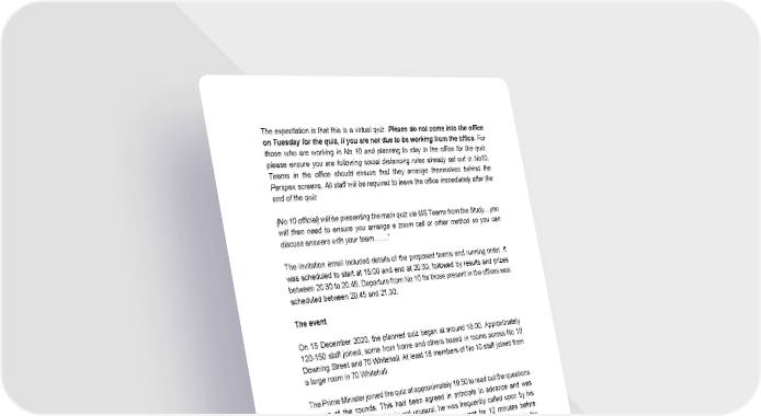 23 The expectation is that this is a virtual quiz. Please do not come into the office on Tuesday for the quiz, if you are not due to be working from the office. For those who are working in No 10 and planning to stay in the office for the quiz, please ensure you are following social distancing rules already set out in No10. Teams in the office should ensure that they arrange themselves behind the Perspex screens. All staff will be required to leave the office immediately after the end of the quiz [No 10 official] Zill be presenting the main qui] via MS Teams from the Stud\«\ou will then need to ensure you arrange a zoom call or other method so you can discuss ansZers Zith \our team««. ́ The invitation email included details of the proposed teams and running order. It was scheduled to start at 18.00 and end at 20.30, followed by results and prizes between 20.30 to 20.45. Departure from No 10 for those present in the offices was scheduled between 20.45 and 21.30. The event On 15 December 2020, the planned quiz began at around 18.00. Approximately 120 - 150 staff joined, some from home and others based in rooms across No 10 Downing Street and 70 Whitehall. At least 18 members of No 10 staff joined from a large room in 70 Whitehall. The Prime Minis ter joined the quiz at approximately 19.50 to read out the questions to one of the rounds. This had been agreed in principle in advance and was confirmed on the day. This is not unusual, he was frequently called upon by his office to attend staff events. H e remained at the event for 12 minutes before returning to his office. There are published photographs of his participation in the event. Food and alcohol was available during the quiz which was purchased by individuals on behalf of their teams. Some t e ams in the office gathered close together around laptop screens. Some staff drank alcohol. A No 10 official sent a message on internal No 10 systems referring to μdrunkenness¶ and advising staff to leave No 10 via the back exit. The No 10 official informe d the investigation team that they did this in order to avoid staff being photographed by the press outside. The quiz finished at approximately 21 . 30. Most of those in the office in No 10 either left or returned to work after the quiz with some remaining continuing to chat and some dr ank alcohol.