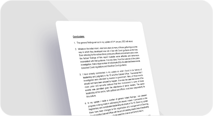 36 Conclusions 1. The general findings set out in my update of 31 st January 2022 still stand. 2. Whatever the initial intent, what took place at many of these gatherings and the way in which they developed was not in line with Covid guidance at the time. Even allowing for the extraordinary pressures officials and advisers were under, the factual findings of this report illustrate some attitudes and behaviours inconsistent with that guidance. It is also clear, from the outcome of the police investigation, that a large number of individuals (83) who attended these events breached Covid regulations and therefore Covi d guidance. 3. I have already commented in my update on what I found to be failures of leadership and judgment in No 10 and the Cabinet Office. The events that I investigated were attended by leaders in government. Many of these events should not have been allowed to happen . It is also the case that some of the more junior civil servants believed that their involvement in some of these events was permitted given the attendance of senior leaders. The senior leadership at the centre, both political and official, must bear responsibility for this culture. 4. In my update I made a number of general limited findings, I am pleased progress is being made in addressing the issues I raised. I commented on the fragmentary and complicated leadership structures in No 10. Since my update there have been changes to the organisation and management of Downing Street and the Cabinet Office with the aim of creating cle arer lines of leadership and accountability and now these need the chance and time to bed in. 5. I found that some staff had witnessed or been subjected to behaviours at work which they had felt concerned about but at times felt unable to raise properly. I was made aware of multiple examples of a lack of respect and poor treatment of security and cleaning staff. This was unacceptable. I am reassured to see that steps have since been taken to introduce more easily accessible means by which to raise concer ns electronically, in person or online, including directly with the Permanent Secretary in No 10. I hope that this will truly embed a culture that welcomes and creates opportunities for challenge and speaking up at all levels. 6. I also made a recommendatio n that steps should be taken to ensure that every Government Department has a clear and robust policy in place covering the consumption of alcohol in the workplace. Since then guidance has been issued to all Government Departments .