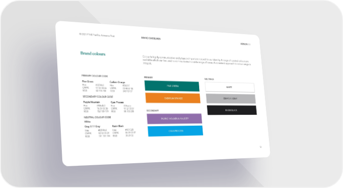 12 © 2021 F’INE Pasifika Aotearoa Trust BRAND GUIDELINES VERSION 1.1 Colour is highly communicative and plays an important role within our identity. A range of curated colours are available which can be used to communicate in a wide range of tones. A consistent approach to colour usage is integral. Brand colours PRIMARY PINE GREEN WHITE CADMIUM ORANGE PRIMARY COLOUR CODE SECONDARY COLOUR CODE NEUTRAL COLOUR CODE NEUTRALS SECONDARY Hex #03746d CMYK 97 00 06 55 RGB 03 116 109 Hex #f3831f CMYK 00 46 87 05 RGB 243 131 31 Hex #986db3 CMYK 15 39 00 30 RGB 152 109 179 Hex #06acec CMYK 97 27 00 07 RGB 06 172 236 Hex #03746d CMYK 02 02 00 24 RGB 191 191 194 Hex #1E1D20 CMYK 06 09 00 87 RGB 30 29 32 White Gray X 11 Gray Raisin Black Purple Mountain Cyan Process Pine Green Cadium Orange PURPLE MOUNTAIN MAJESTY CYAN PROCESS GRAY X 11 GRAY RAISIN BLACK