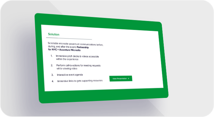 Solution Scrollable microsite powers all communications before, during, and after the event: Partnership for NYC + Accenture Microsite 1. Immersive pitch decks & videos accessible within the experience 2. Perform call-to-actions for meeting requests while viewing video 3. Interactive event agenda View Presentation → 4. Immersive links to gets supporting resources