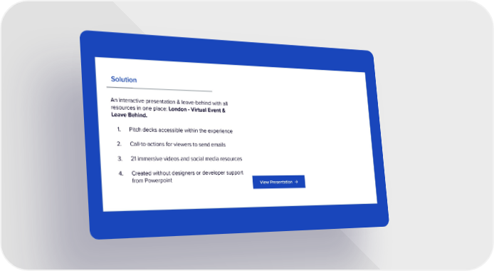 Solution An interactive presentation & leave-behind with all resources in one place: London - Virtual Event & Leave Behind. 1. Pitch decks accessible within the experience 2. Call-to-actions for viewers to send emails 3. 21 immersive videos and social media resources 4. Created without designers or developer support from Powerpoint View Presentation →
