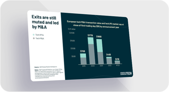 Exits are still European tech M&A transaction value and tech IPO market cap at muted and led close of first trading day ($B) by announcement year Exit value by M&A $200B $177B Tech IPOs $166B Tech M&A $150B $100B $70B $48B $50B $21B Source: S&P Global Market Intelligence 2019 2020 2021 2022 H1’23 Notes: S&P Capital IQ Platform, as of date 15 May 2023, for illustrative purposes only. H1 figures extrapolated linearly based on year to date figures. Includes announced and completed M&A transactions only (excluding since terminated/withdrawn).