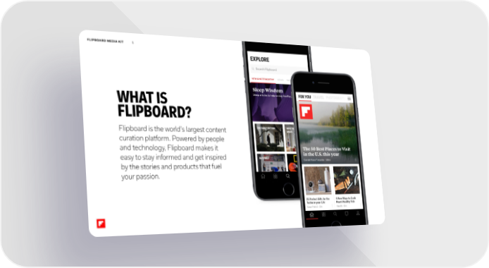 FLIPBOARD MEDIA KIT 1 WHAT IS FLIPBOARD? Flipboard is the world’s largest content curation platform. Powered by people and technology, Flipboard makes it easy to stay informed and get inspired by the stories and products that fuel your passion.