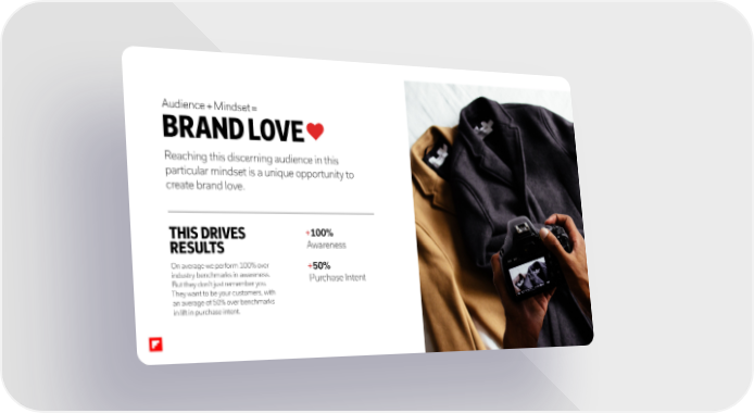 FLIPBOARD MEDIA KIT 4 Audience + Mindset= BRAND LOVE Reaching this discerning audience in this particular mindset is a unique opportunity to create brand love. THIS DRIVES +100% RESULTS Awareness On average we perform 100% over +50% industry benchmarks in awareness. Purchase Intent But they don't just remember you. They want to be your customers, with an average of 50% over benchmarks in lift in purchase intent.