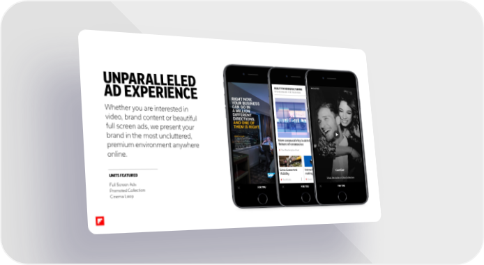 FLIPBOARD MEDIA KIT 6 UNPARALLELED AD EXPERIENCE Whether you are interested in video, brand content or beautiful full screen ads, we present your brand in the most uncluttered, premium environment anywhere online. UNITS FEATURED Full Screen Ads Promoted Collection Cinema Loop