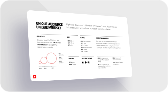 FLIPBOARD MEDIA KIT 3 UNIQUE AUDIENCE Flipboard draws over 100 million of the world's most discerning and UNIQUE MINDSET influential users who arrive in a uniquely receptive mindset. OUR REACH AGE GLOBAL ASPIRATIONAL MINDSET Since our launch in 2010, our user 35% 25–44 23% North America Our users are influential, successful, and base has grown to over 100 million 59% 25–54 37% Asia want more—whether it be in their personal or monthly active users (MAU) 38% 50+ 27% Europe professional lives. This is why we have more spanning every country. 10% South America CEO's per user than any other online platform. 4% Africa 1% Oceania 2017 +100 Million 2016 GENDER ON EVERY DEVICE 90% It is important to 80% I always try to 60 Million 2015 be well-informed about achieve more in life 30 Million 52% Male things 78% I always like to try 48% Female 87% It is important for new products 2015 2016 2017 me to continue to develop new skills in life
