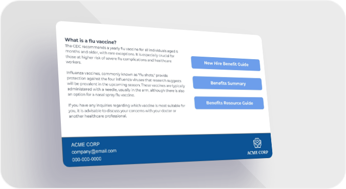 What is a flu vaccine? The CDC recommends a yearly flu vaccine for all individuals aged 6 months and older, with rare exceptions. It is especially crucial for those at higher risk of severe flu complications and healthcare New Hire Benefit Guide workers. Influenza vaccines, commonly known as "flu shots," provide protection against the four influenza viruses that research suggests Benefits Summary will be prevalent in the upcoming season. These vaccines are typically administered with a needle, usually in the arm, although there is also an option for a nasal spray flu vaccine. Benefits Resource Guide If you have any inquiries regarding which vaccine is most suitable for you, it is advisable to discuss your concerns with your doctor or another healthcare professional. ACME CORP company@email.com 000-000-0000 ACME CORP