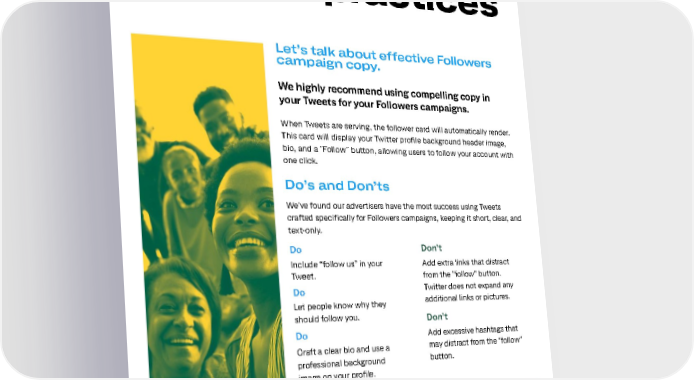 Copy best practices Let’s talk about effective Followers campaign copy. We highly recommend using compelling copy in your Tweets for your Followers campaigns. When Tweets are serving, the follower card will automatically render. This card will display your Twitter profile background header image, bio, and a "Follow" button, allowing users to follow your account with one click. Do’s and Don’ts We've found our advertisers have the most success using Tweets crafted specifically for Followers campaigns, keeping it short, clear, and text-only. Do Don’t Include “follow us” in your Add extra links that distract Tweet. from the "follow" button. Do Twitter does not expand any Let people know why they additional links or pictures. should follow you. Don’t Do Add excessive hashtags that Craft a clear bio and use a may distract from the "follow" professional background button. image on your profile. Actionable copy drives Pro Tip followers. Tell people why they should follow you. 07