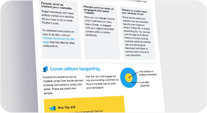 Audience Targeting Existing connections targeting Yes, Core Audience Targeting is a big help in finding a large and relevant audience. But maybe you’re looking for a more specific group of people? Here’s where you find people who have already shown interest in your brand. People who’ve People who’ve seen or People or customers visited your website engaged with past you already know Target individuals who have Tweets These are the people you already visited your website. Now you can retarget anyone already know are interested. All you have to do is install who’s watched your video, Identify them based on Twitter’s pixel. liked a Tweet, or engaged emails, Twitter IDs, or mobile with your organic/promoted advertising IDs. You can also For detailed instructions on content within a certain work through an Audience how to do this, visit our timeframe. Partner to import existing Tailored Audiences for Web customer audiences directly page that has step-by-step into your Ads account. instructions. Reconnect with them or exclude them to focus on new acquisition. Look-alikes targeting Core audience & Expand the audience you’ve that like, act, and engage the existing connections created using Core Audiences and way your existing customers do. Existing Connections using Look- This is the best way to scale Look-alike alikes. These are brand new your campaigns. audiences people Pro Tip #2 Have more questions about targeting? Visit our detailed Q&As on: Device targeting | Geo, gender, and language targeting | Interest and follower targeting | Keyword targeting | Tailored Audiences 11