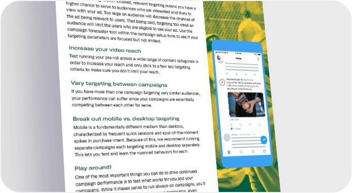 Audience Targeting Other Targeting Tips to optimize your campaign Target with focus Creating campaigns with focused, relevant targeting means you have a higher chance to serve to audiences who are interested and likely to view with your ad. Too large an audience will decrease the chances of the ad being relevant to users. That being said, targeting too small an audience will limit the users who are eligible to see your ad. Use the campaign forecaster tool within the campaign setup form to see if your targeting parameters are focused but not limited. Increase your video reach Test running your pre-roll across a wide range of content categories in order to increase your reach and only stick to a few key targeting criteria to make sure you don’t limit your reach. Vary targeting between campaigns If you have more than one campaign targeting very similar audiences, your performance can suffer since your campaigns are essentially competing between each other for serve. Break out mobile vs. desktop targeting Mobile is a fundamentally different medium than desktop, characterized by frequent quick sessions and spur-of-the-moment spikes in purchase intent. Because of this, we recommend running separate campaigns each targeting mobile and desktop separately. This lets you test and learn the nuanced behaviors for each. Play around! One of the most important things you can do to drive continued campaign performance is to test what works for you and your campaigns. While it makes sense to run always-on campaigns, you’ll want to continually refresh and optimize your campaigns, given Twitter’s ever-changing, real-time nature. Remove low performing keywords, interests, and handles, and replace them with ones that are similar to the high performing ones. 13