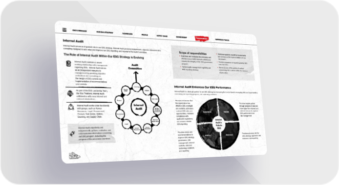 CEO’S MESSAGE OUR ESG STRATEGY DASHBOARD PEOPLE SUPPLY CHAIN ENVIRONMENT TRANSPARENCY REFERENCE TABLES Internal Audit Internal Audit serves an important role in our ESG strategy. Internal Audit provides independent, objective assurance and Scope of responsibilities • Monitors regulatory reporting requirements consulting designed to add value and improve our ESG reporting, and reports to the Audit Committee. and advises on the implementation of new • Examines and evaluates the adequacy and disclosures The Role of Internal Audit Within Our ESG Strategy is Evolving effectiveness of ESG internal controls and ensures the integrity of the ESG governance • Provides assurance of reported priority ESG program data and KPIs Internal Audit maintains a sound Audit • Partners with management regarding our • Serves as one of the points of contact working relationship with management Committee ESG reporting strategy concerning ESG matters within the Finance regarding ESG. Internal Audit serves organization as an independent resource to management by providing objective evaluations and consulting on the design of ESG controls and implementation of recommendations and controls. Internal Audit Enhances Our ESG Performance Sourcing Supply Utilities Internal Audit is a strategic partner to our ESG strategy by increasing the level of trust in managing risks and opportunities, As part of the ESG Leadership Team, Chain the Vice President, Internal Audit measuring and reporting progress, and achieving ambitions. collaborates with many internal and external stakeholders. Real Estate Provides assurance that Product the organization has Provides insights gained Internal Audit works cross functionally Internal effective ESG oversight through analysis of data and with groups, such as Human Audit All Other and controls, addresses information from internal and Resources, Legal, Procurement, Functional material ESG risks and external sources to improve Departments Assurance Insight Product, Real Estate, Utilities, Procurement opportunities, maintains ESG performance and Sourcing, and Supply Chain. compliance with risk management External applicable regulations, Internal Stakeholders and ensures reliable Legal ESG reporting Audit’s Internal Audit objectively and Human Senior Role in independently gathers, evaluates, and Resources Executives ESG communicates information concerning Provides advice and our ESG program, including the recommendations to Advice Advocacy Provides advocacy for the progress of the processes examined. improve ESG strategy, ESG strategy, approach, risk governance, risk tolerance, and reporting management, internal controls, data and technology solutions, 5656 and reporting