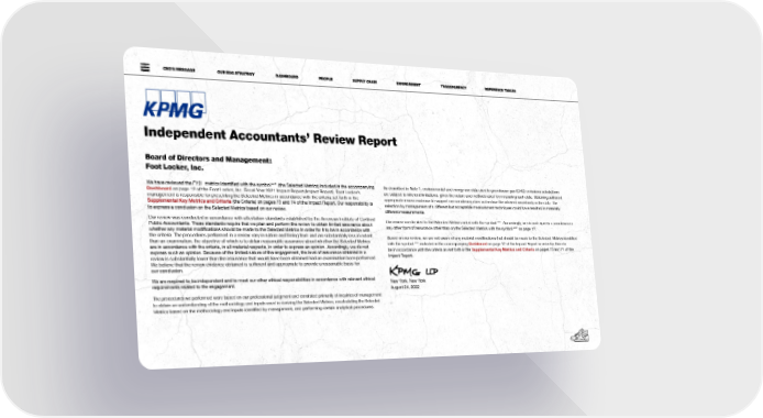 CEO’S MESSAGE OUR ESG STRATEGY DASHBOARD PEOPLE SUPPLY CHAIN ENVIRONMENT TRANSPARENCY REFERENCE TABLES Independent Accountants’ Review Report Board of Directors and Management: Foot Locker, Inc. We have reviewed the FY21 metrics identified with the symbol “*” (the Selected Metrics) included in the accompanying As described in Note 1, environmental and energy use data used in greenhouse gas (GHG) emissions calculations Dashboard on page 12 of the Foot Locker, Inc. Fiscal Year 2021 Impact Report (Impact Report). Foot Locker’s are subject to inherent limitations, given the nature and methods used for measuring such data. Obtaining sufficient management is responsible for presenting the Selected Metrics in accordance with the criteria set forth in the appropriate review evidence to support our conclusion does not reduce the inherent uncertainty in the data. The Supplemental Key Metrics and Criteria (the Criteria) on pages 73 and 74 of the Impact Report. Our responsibility is selection by management of a different but acceptable measurement techniques could have resulted in materially to express a conclusion on the Selected Metrics based on our review. different measurements. Our review was conducted in accordance with attestation standards established by the American Institute of Certified Our review was limited to the Selected Metrics noted with the symbol “*”. Accordingly, we do not express a conclusion or Public Accountants. Those standards require that we plan and perform the review to obtain limited assurance about any other form of assurance other than on the Selected Metrics with the symbol “*” on page 12. whether any material modifications should be made to the Selected Metrics in order for it to be in accordance with the criteria. The procedures performed in a review vary in nature and timing from and are substantially less in extent Based on our review, we are not aware of any material modifications that should be made to the Selected Metrics identified than an examination, the objective of which is to obtain reasonable assurance about whether the Selected Metrics with the symbol “*” included in the accompanying Dashboard on page 12 of the Impact Report in order for them to are in accordance with the criteria, in all material respects, in order to express an opinion. Accordingly, we do not be in accordance with the criteria as set forth in the Supplemental Key Metrics and Criteria on pages 73 and 74 of the express such an opinion. Because of the limited nature of the engagement, the level of assurance obtained in a Impact Report. review is substantially lower than the assurance that would have been obtained had an examination been performed. We believe that the review evidence obtained is sufficient and appropriate to provide a reasonable basis for our conclusion. We are required to be independent and to meet our other ethical responsibilities in accordance with relevant ethical New York, New York requirements related to the engagement. August 24, 2022 The procedures we performed were based on our professional judgment and consisted primarily of inquiries of management to obtain an understanding of the methodology and inputs used in deriving the Selected Metrics, recalculating the Selected Metrics based on the methodology and inputs identified by management, and performing certain analytical procedures. 77