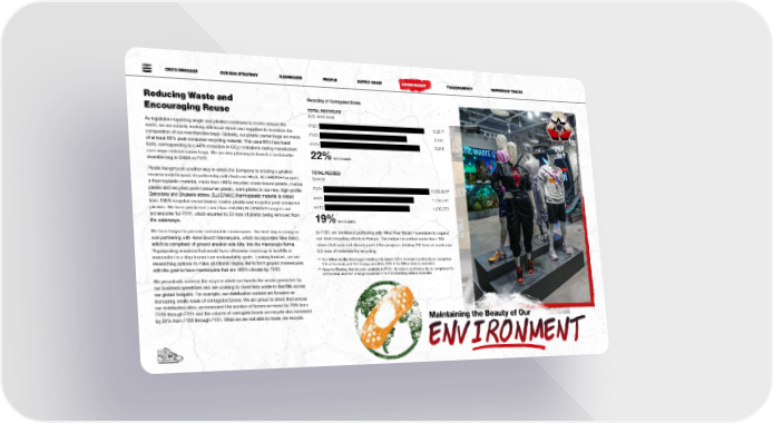 CEO’S MESSAGE OUR ESG STRATEGY DASHBOARD PEOPLE SUPPLY CHAIN ENVIRONMENT TRANSPARENCY REFERENCE TABLES Reducing Waste and Recycling of Corrugated Boxes Encouraging Reuse TOTAL RECYCLED (U.S. short tons) As legislation regarding single-use plastics continues to evolve around the FY21 6,32125 world, we are actively working with local stores and suppliers to transition the FY20 5,191 composition of our merchandise bags. Globally, our plastic carrier bags are made of at least 85% post-consumer recycling material. This uses 80% less fossil FY19 5,945 fuels, corresponding to a 40% reduction in CO e emissions during manufacture 2 over virgin material carrier bags. We are also planning to launch a sustainable 22% YoY CHANGE reusable bag in EMEA in FY22. Plastic hangers are another way in which the Company is creating a positive TOTAL REUSED environmental impact. In partnership with Arch and Hook, BLUEWAVE hangers, (boxes) a thermoplastic material, made from 100% recycled ocean bound plastic, marine 26 plastic and recycled post-consumer plastic, were piloted in our new, high-profile FY21 2,059,903 Barcelona and Brussels stores. BLUEWAVE thermoplastic material is crated FY20 1,734,091 from 100% recycled ocean bound, marine plastic and recycled post-consumer plastics. We have purchased more than 750,000 BLUEWAVE hangers and FY19 1,635,372 accessories for FY22, which equated to 53 tons of plastic being removed from 19% YoY CHANGE the waterways. We have begun to procure sustainable mannequins. The first step in doing so In FY21, we continued partnering with Mind Your Waste Foundation to expand was partnering with Hans Boodt Mannequins, which incorporates Nike Grind, our store recycling efforts in Europe. This helped us collect waste from 103 which is comprised of ground sneaker sole bits, into the mannequin forms. stores that were not already part of the program, totaling 107 tons of waste and Repurposing sneakers that would have otherwise ended up in landfills or 6.5 tons of materials for recycling. incinerated is a step toward our sustainability goals. Looking forward, we are 25 Our Milton facility first began tracking this data in 2021. Its total recycling figure comprises researching options to make additional display items from ground mannequins 1% of the total, and YoY change would be 20% if the Milton data is excluded. with the goal to have mannequins that are 100% circular by FY23. 26 Data for Eastbay first became available in FY21. Its total reused boxes figure comprises 2% of the total, and YoY change would be 17% if the Eastbay data is excluded. We proactively address the ways in which we handle the waste generated by our business operations and are working to divert less waste to landfills across our global footprint. For example, our distribution centers are focused on increasing onsite reuse of corrugated boxes. We are proud to share that across our distribution sites, we increased the number of boxes we reuse by 19% from FY20 through FY21 and the volume of corrugate boxes we recycle also increased by 22% from FY20 through FY21. What we are not able to reuse, we recycle. Maintaining the Beauty of Our 5050