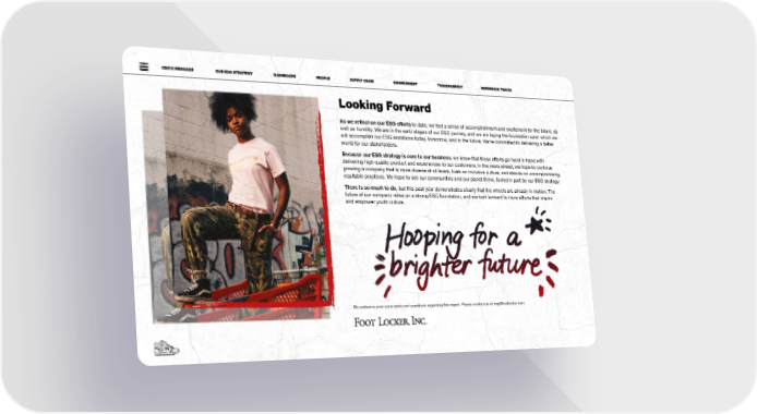 CEO’S MESSAGE OUR ESG STRATEGY DASHBOARD PEOPLE SUPPLY CHAIN ENVIRONMENT TRANSPARENCY REFERENCE TABLES Looking Forward As we reflect on our ESG efforts to date, we feel a sense of accomplishment and excitement for the future, as well as humility. We are in the early stages of our ESG journey, and we are laying the foundation upon which we will accomplish our ESG ambitions today, tomorrow, and in the future. We’re committed to delivering a better world for our stakeholders. Because our ESG strategy is core to our business, we know that these efforts go hand in hand with delivering high-quality product and experiences to our customers. In the years ahead, we hope to continue growing a company that is more diverse at all levels, fuels an inclusive culture, and stands on uncompromising, equitable practices. We hope to see our communities and our planet thrive, fueled in part by our ESG strategy. There is so much to do, but this past year demonstrates clearly that the wheels are already in motion. The future of our company relies on a strong ESG foundation, and we look forward to more efforts that inspire and empower youth culture. We welcome your comments and questions regarding this report. Please contact us at [email protected]. 7676