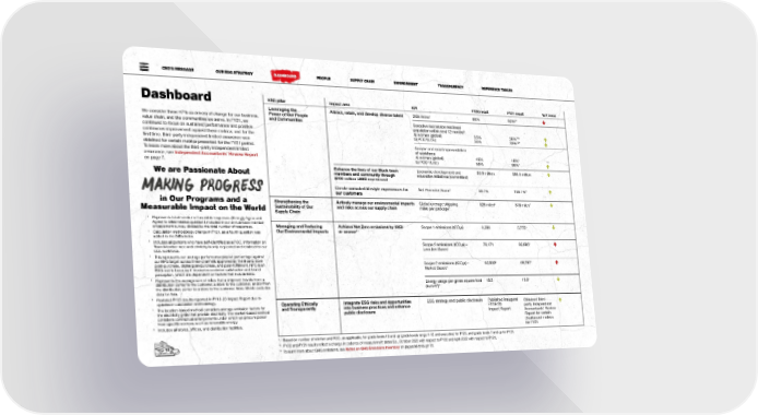 CEO’S MESSAGE OUR ESG STRATEGY DASHBOARD PEOPLE SUPPLY CHAIN ENVIRONMENT TRANSPARENCY REFERENCE TABLES Dashboard ESG pillar Impact area KPI FY20 result FY21 result YoY trend Attract, retain, and develop diverse talent DIBs index1 2 Leveraging the 88% 83%* á We consider these KPIs as drivers of change for our business, Power of Our People and Communities Executive succession readiness value chain, and the communities we serve. In FY21, we 9 population within next 12 months : continued to focus on sustained performance and positive a) women (global) 33% 38%10* á continuous improvement against these metrics, and for the 3 10 á b) POC (U.S.) 34% 39% * first time, third-party independent limited assurance was obtained for certain metrics presented for the FY21 period. Gender and racial representation To learn more about the third-party independent limited of workforce a) women (global) 49% 49%* — assurance, see Independent Accountants’ Review Report 3 á on page 7. b) POC (U.S.) 85% 86%* Enhance the lives of our Black team Economic development and $3.9 million $50.0 million á We are Passionate About members and community through education initiatives (committed) $200 million LEED investment Create unrivaled lifestyle experiences for Net Promoter Score4 36.7% 106.7%* á our customers in Our Programs and a Strengthening the Actively manage our environmental impacts Global average shipping 826 miles6 818 miles* á Measurable Impact on the World Sustainability of Our and risks across our supply chain miles per package5 Supply Chain 1 Represents total number of favorable responses (Strongly Agree and Agree) to DIBs-related questions included in our annual team member Managing and Reducing Achieve Net Zero emissions by 2050 Scope 1 emissions (tCO e) 6,588 5,775* engagement survey, divided by the total number of responses. 2 á 2 11 Calculation methodology change in FY21, as a fourth question was Our Environmental Impacts or sooner added to the DIBs Index. 3 Includes all persons who have self-identified as a POC. Information on Scope 2 emissions (tCO e) – 76,471 85,893* á Team Member race and ethnicity is only requested and retained for our 2 U.S. workforce. Location Based 4 This represents our average performance payout percentage against our NPS target across three-channels approved by the Board: store 6 á post-purchase, digital post-purchase, and post-fulfillment. NPS is an Scope 2 emissions (tCO e) – 65,839 69,292* 2 ESG metric because it measures customer satisfaction and brand 7 Market Based perception, which are dependent on factors that include ESG. 5 Represents the average sum of miles that a shipment travels from: a distribution center to the customer, a store to the customer, and/or from Energy usage per gross square foot 19.2 15.3* á the distribution center to a store to the customer. Note: Metric excludes 2 8 (kwh/ft ) data for Asia. 6 Restated FY20 results reported in FY19-20 Impact Report due to updates in calculation methodology. 7 The location-based method considers average emission factors for Operating Ethically Integrate ESG risks and opportunities ESG strategy and public disclosure Published inaugural Obtained third- á the electricity grids that provide electricity. The market-based method and Transparently into business practices and enhance FY19-20 party Independent considers contractual arrangements under which we procure power public disclosure Impact Report Accountants’ Review from specific sources, such as renewable energy. Report for certain 8 Includes all stores, offices, and distribution facilities. Dashboard metrics for FY21 9 Based on number of women and POC, as applicable, for grade levels 10 and up (grade levels range 1-12 and executive) for FY20, and grade levels 7 and up for FY21. 1212 10 FY20 and FY21 results reflect a change in cadence of measurement dates (i.e., October 2020 with respect to FY20 and April 2022 with respect to FY21). 11 To learn more about GHG emissions, see Notes on GHG Emissions Inventory on pages 66 through 72.