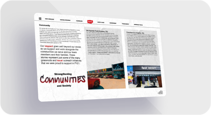 CEO’S MESSAGE OUR ESG STRATEGY DASHBOARD PEOPLE SUPPLY CHAIN ENVIRONMENT TRANSPARENCY REFERENCE TABLES Community We operate 62 Community and Power Stores across the geographies in which Old Spanish Trail (Houston, TX) Crenshaw (Los Angeles, CA) we operate. Community Stores are off-mall stores that focus on creating The Foot Locker Community Store on Old Spanish Trail truly Crenshaw, the neighborhood known as the heart of Black commerce authentic trust with local customers and provide elevated shopping experiences encompasses the expression “for the community, by the community.” in Los Angeles, is home to global cultural icons and athletes, such as within community spaces. Power Stores are stores that provide a seamless The rapid–growing South Side has become the nucleus of Houston’s Ice Cube, Ice-T, and Baron Davis. The foundation of the Crenshaw and convenient shopping journey for the full family. Community and Power Black community, and home of global icons, such as Beyoncé. Upon Community Store is rooted within the core neighborhood values Stores both provide pinnacle retail experiences that deliver connected customer arriving at the store, physical connection is established through the established by beloved community advocates like the late Nipsey interactions through service, experience, product, and a sense of community. lens of local award-winning artist, Reginald Adam. As you step through Hustle. In establishing the store, we partnered with local customers, Building from 10 Power Stores in FY20, an additional 27 Power Stores and 25 the front door, you are welcomed by locally-hired staff—sourced organizations, and influencers to establish an authentic connection Community Stores were opened in FY21. from in-store job fairs—and offered a free haircut, refreshments, or and vision that reflects the values of the Crenshaw community. Local even a job readiness training program. As you browse locally-curated artists are honored throughout, with the storefront and murals created Our impact goes well beyond our stores collections, you’ll see community-based designers showcased, by Terrick Gutierrez and Gustavo Zermeno, and local brand designers such as Diverscity Clothing Co. If you timed your arrival with one of featured, including Bad Girl Good Human, Something Out of Nothing, as we support and work alongside the our local holidays or events, such as “Screw Day,” you would hear and YANG. The tastes of Crenshaw have also been showcased in this communities we serve and our team Houston-inspired “Chopped and Screwed” music played by local DJs hyperlocal experience, as community staples, Slauson Donuts, Harun and “Screwston” Team Edition tees on display. Coffee, and Hanks Mini Market distribute free groceries from a pop-up members and their families. These stand located outside the store. stories represent just some of the many grassroots and local outreach initiatives that we were proud to support in FY21. Strengthening and Society 1515