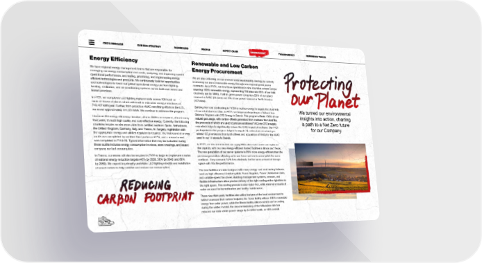 CEO’S MESSAGE OUR ESG STRATEGY DASHBOARD PEOPLE SUPPLY CHAIN ENVIRONMENT TRANSPARENCY REFERENCE TABLES Energy Efficiency Renewable and Low Carbon We have regional energy management teams that are responsible for Energy Procurement managing our energy consumption and costs, analyzing, and improving current operational performance, and testing, prioritizing, and implementing energy We are also delivering on our environmental sustainability strategy by actively efficient technologies and products. We continuously look for opportunities increasing our use of renewable energy through new regional green power and technologies to lower our global operational energy use from lighting, contracts. As of FY21, we now have operations in nine countries across Europe heating, ventilation, and air conditioning systems across both our owned and sourcing 100% renewable energy, representing 700 sites and 85% of our total leased premises. electricity use (in MWh). Further, green power comprises 23% of our power sourced in APAC (34 sites) and 6% of our power sourced in North America In FY21, we completed LED lighting replacements across 100 front- or (137 sites). back-of-house of stores which will result in estimated energy reductions of 748,467 kWh/year. Further, from proactive HVAC retrofitting efforts in the U.S., Building from our contracting in FY20 for nuclear energy to supply the electricity We turned our environmental we saved approximately 641,351 kWh. We continue to enhance this program. of our retail stores in Ohio, in FY21, we began participating in a Natural Gas Balance Program with DTE Energy in Detroit. This program offsets 100% of our insights into action, charting Under an EU energy efficiency directive, all non-SMEs are required, at least every natural gas usage, with carbon offsets generated from methane from landfills, four years, to audit high quality and cost-effective energy. Currently, the following the proceeds of which are used to procure additional RNG into DTE’s supply a path to a Net Zero future countries require on-site store visits from certified auditors: Spain, Netherlands, mix which helps to significantly reduce the GHG impact of methane. Our FY21 for our Company. the United Kingdom, Germany, Italy, and France. In Hungary, registration with participation in the program helped to negate 24 metric tons of natural gas- the appropriate energy and utilities regulator is required. The first round of energy related CO e emission (from both offsets and acquisition of RNG) for the HVAC audits was completed by certified third parties in FY15, and a second round 2 used in our 14 stores in Detroit. was completed in FY19-20. Typical information that may be evaluated during these audits includes energy consumption invoices, store drawings, and leased In FY21, we decommissioned our aging Milwaukee data center and replaced company car fuel consumption. the capacity with two new energy-efficient hosted facilities in Illinois and Texas. The new generation of our server systems is 29% more energy-efficient than the In France, our stores will also be required in FY22 to begin to implement a series previous generation, allowing us to use fewer servers to accomplish the same of national energy reduction targets (40% by 2030, 50% by 2040, and 60% workload. They consume 14% less electricity for the same amount of storage by 2050). We expect to primarily undertake LED lighting retrofits and installation space with 10x the performance. of smart meters to help monitor and reduce our consumption. The new facilities are also designed with many energy- and cost-saving features, such as high-efficiency Uninterruptible Power Supplies, Power Distribution Units, and variable-speed fan drives. Building management systems, sensors, and flexible infrastructure allow precise delivery of the right cooling at the right time to the right space. This cooling process is also water-free, while minimal amounts of water are used for humidification and facility maintenance. These new third-party facilities also utilize features of the local environment to further decrease their carbon footprint; the Texas facility utilizes 100% renewable energy from solar power, while the Illinois facility utilizes outside air for cooling during the winter. In total, the decommissioning of the Milwaukee site has reduced our data center power usage by 54 kWh/month, or 48% overall. 4848