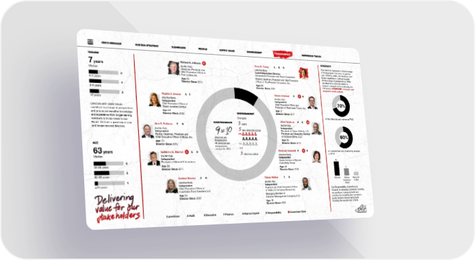 CEO’S MESSAGE OUR ESG STRATEGY DASHBOARD PEOPLE SUPPLY CHAIN ENVIRONMENT TRANSPARENCY REFERENCE TABLES TENURE DIVERSITY Richard A. Johnson E Dona D. Young A E R Our directors represent a diverse range 7 years (he/him/his) (she/her/hers) of backgrounds—in terms of gender, Median Chairman, President and Lead Independent Director age, ethnicity, skills, and business and Chief Executive Officer of Independent Executive and Board Consultant board experience—with an equally Foot Locker, Inc. Retired Chairman, President and Chief Executive diverse range of perspectives. What 3 Officer of The Phoenix Companies, Inc. we share is a common desire to 0-2 years Age: 64 support management in achieving the Director Since: 2014 Age: 68 Company’s PURPOSE to inspire and 4 Director Since: 2001 empower youth culture. 3-8 years 3 Virginia C. Drosos A F Steven Oakland E F R 9 years (he/him/his) > (she/her/hers) Independent Independent Chief Executive Officer and 70% Directors with varied tenure Chief Executive Officer of President of TreeHouse Foods, Inc. Signet Jewelers Limited Age: 61 contribute to a range of perspectives Age: 59 Director Since: 2014 and ensure we transition knowledge Director Since: 2022 REFRESHMENT and experience from longer-serving Over past of the directors are women or POC members to those newer to our INDEPENDENCE Ulice Payne, Jr. A E R Board. We have a good mix of new Alan D. Feldman F H years (he/him/his) and longer-tenured directors. (he/him/his) Independent Independent new directors added President of Cyber-Athletix, LLC Retired Chairman, President and President and Managing Member Chief Executive Officer of Midas, Inc. directors are of Addison-Clifton, LLC 60% Age: 70 independent. Age: 66 AGE Director Since: 2005 All directors are Director Since: 2016 independent, and except the CEO. Kimberly Underhill E H R of committees are chaired by women 63 years Guillermo G. Marmol A E H (he/him/his) directors retired (she/her/hers) or POC Median Independent Independent Senior Advisor of Boston 4 4 President of Marmol & Associates Consulting Group 38-59 years Age: 69 Age: 58 Director Since: 2011 Director Since: 2016 2 5 1 60-69 years Darlene Nicosia A H Tristan Walker F R Women African Hispanic/ 1 (she/her/hers) (he/him/his) American/ Latinx 70 years Independent Black ≥ Independent Chief Executive Officer of Founder and Chief Executive Officer Our Responsibility Committee is Hearthside Food Solutions LLC of Walker & Company Brands Inc. focused on ensuring continued diversity Age: 54 Managing Member of on our Board during refreshment Director Since: 2020 Heirloom Management Company, LLC activities by requiring that candidate Age: 38 pools include diverse individuals Director Since: 2020 meeting the recruitment criteria. Committees A Audit E Executive F Finance H Human Capital R Responsibility Committee Chair 5353