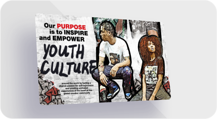 Our PURPOSE is to INSPIRE and EMPOWER around the world by fueling a shared passion for self-expression and creating unrivaled experiences at the heart of the global sneaker community