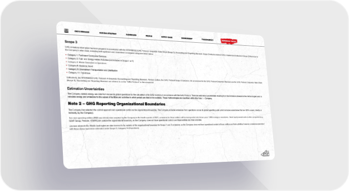 CEO’S MESSAGE OUR ESG STRATEGY DASHBOARD PEOPLE SUPPLY CHAIN ENVIRONMENT TRANSPARENCY REFERENCE TABLES Scope 3 GHG emissions information has been prepared in accordance with the WRI/WBCSD GHG Protocol: Corporate Value Chain (Scope 3), Accounting and Reporting Standard. Scope 3 includes indirect GHG emissions (not included in Scope 2) that occur in the Company’s value chain, including both upstream and downstream emissions categories listed below: • Category 1: Purchased Goods and Services • Category 3: Fuel- and Energy-related Activities (not included in Scope 1 or 2) • Category 5: Waste Generated in Operations • Category 6: Business Travel • Category 9: Downstream Transportation and Distribution • Category 14: Franchises Collectively, the WRI/WBCSD GHG Protocol: A Corporate Accounting and Reporting Standard, Revised Edition, the GHG Protocol Scope 2 Guidance: An amendment to the GHG Protocol Corporate Standard and the GHG Protocol: Corporate Value Chain (Scope 3), Accounting and Reporting Standard are referred to as the “GHG Protocol” in this document. Estimation Uncertainties The Company obtains energy use data from across its global operations for the calculation of its GHG inventory in accordance with the GHG Protocol. There are estimation uncertainties resulting from the limitations inherent in the methodologies used to calculate energy and emissions for the subset of facilities and activities in which actual use data is not available. These methodologies are described within this Note 1 – Company. Note 2 – GHG Reporting Organizational Boundaries The Company has selected the control approach and operational control as the organizational boundary. The Company includes emissions from operations across its global operating units (which includes subsidiaries that are 100% owned, directly or indirectly, by the Company). Two new operating entities (WSS and atmos) were acquired by the Company in the fourth quarter of 2021; emissions for these entities will be incorporated into future years’ GHG emissions inventories. Direct equity investments in other companies (e.g., GOAT Group, Pensole, NTWRK) are outside the organizational boundary, as the Company does not have operational control over these entities and their activities. Licensee stores in the Middle East region are also deemed to be outside of the organizational boundary for Scope 1 and 2 emissions, as the Company does not have operational control of these entities and their activities, however, emissions associated with these stores have been estimated under Scope 3, Category 14 (Franchises). 6767