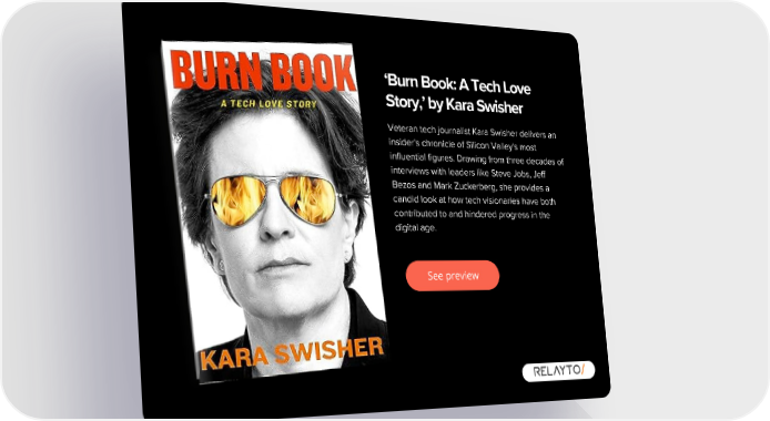 ‘Burn Book: A Tech Love Story,’ by Kara Swisher Veteran tech journalist Kara Swisher delivers an insider's chronicle of Silicon Valley's most influential figures. Drawing from three decades of interviews with leaders like Steve Jobs, Jeff Bezos and Mark Zuckerberg, she provides a candid look at how tech visionaries have both contributed to and hindered progress in the digital age. See preview