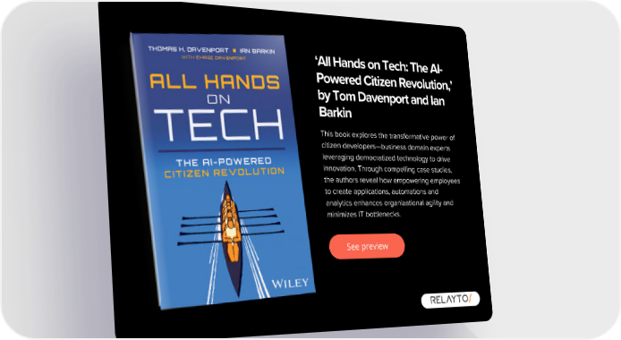 ‘All Hands on Tech: The AI- Powered Citizen Revolution,’ by Tom Davenport and Ian Barkin This book explores the transformative power of citizen developers—business domain experts leveraging democratized technology to drive innovation. Through compelling case studies, the authors reveal how empowering employees to create applications, automations and analytics enhances organizational agility and minimizes IT bottlenecks. See preview