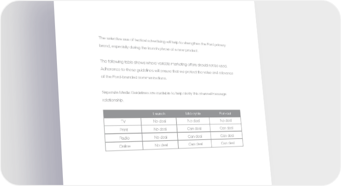 MW-Ford_Brand_60-99.qxp 24/7/06 6:45 pm Page 96 The selective use of tactical advertising will help to strengthen the Ford primary brand, especially during the launch phase of a new product. The following table shows where variable marketing offers should not be used. Adherence to these guidelines will ensure that we protect the value and relevance of the Ford-branded communications. Separate Media Guidelines are available to help clarify this channel/message relationship. Launch Mid-cycle Run-out TV No deal No deal No deal Print No deal Can deal Can deal Radio No deal Can deal Can deal Online No deal Can deal Can deal 96