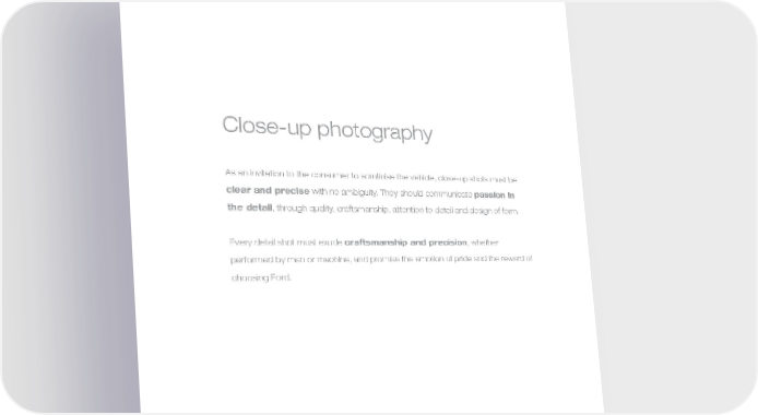 MW-Ford_Brand_60-99.qxp 24/7/06 11:09 am Page 60 Close-up photography As an invitation to the consumer to scrutinise the vehicle, close-up shots must be clear and precisewith no ambiguity. They should communicate passion in the detail, through quality, craftsmanship, attention to detail and design of form. Every detail shot must exude craftsmanship and precision, whether performed by man or machine, and promise the emotion of pride and the reward of choosing Ford. 60