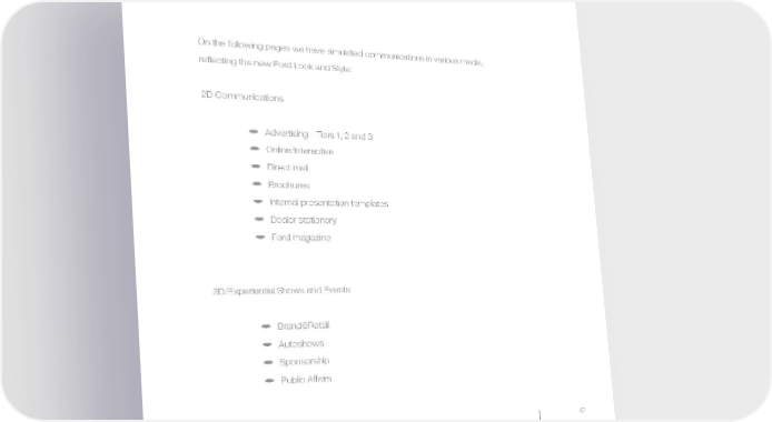 MW-Ford_Brand_60-99.qxp 24/7/06 11:09 am Page 67 On the following pages we have simulated communications in various media, reflecting the new Ford Look and Style: 2D Communications a Advertising – Tiers 1, 2 and 3 a Online/Interactive a Direct mail a Brochures a Internal presentation templates a Dealer stationery a Ford magazine 3D/Experiential Shows and Events a Brand@Retail a Autoshows a Sponsorship a Public Affairs 67