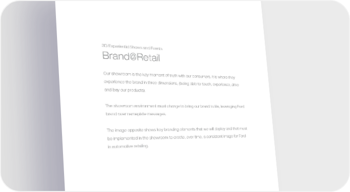 MW-Ford_Brand_60-99.qxp 24/7/06 3:50 pm Page 86 3D/Experiential Shows and Events Brand@Retail Our showroom is the key moment of truth with our consumers. It is where they experience the brand in three dimensions, (being able to touch, experience, drive and buy our products). The showroom environment must change to bring our brand to life, leveraging Ford brand over nameplate messages. The image opposite shows key branding elements that we will deploy and that must be implemented in the showroom to create, over time, a consistent image for Ford in automotive retailing. 86