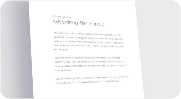 MW-Ford_Brand_60-99.qxp 24/7/06 3:15 pm Page 72 2D Communications Advertising Tier 2 and 3 Tier 2 advertising picks up on many of the look and style elements from the Tier 1 advertising – to ensure continuity and consistency. As an example, the right-bleed ‘white box’ and the logo lockup are used in Tier 2 advertising, too. The product or service offering is to be consolidated in a separate ‘offer box’ as illustrated on the opposite page. Local markets will in most cases have their own in-market Tier 3 advertising guidelines, which need to be followed. Tier 3 advertising does, however, need to utilise centrally produced car shots and follow brand guidelines wherever any ‘Ford’ branding is used. Specific technical guidelines exist for all technical aspects of the new look and style framework; these can be found in the online Ford Look and Style Arena. 72