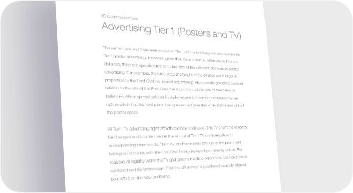 MW-Ford_Brand_60-99.qxp 24/7/06 11:46 am Page 70 2D Communications Advertising Tier 1 (Posters and TV) The same Look and Style elements as in Tier 1 print advertising are also featured in Tier 1 poster advertising. However, given that this medium is often viewed from a distance, there are specific rules as to the size of the different elements in poster advertising. For example, the rules state the height of the orange bar is larger in proportion to the Ford Oval (vs. in print advertising). Also specific guidance exists in relation to the size of the Ford Oval, the logo size and the size of headlines. In instances where special outdoor formats require it, there is a secondary layout option which has the ‘white box’ being extended over the entire right-hand side of the poster space. All Tier 1 TV advertising signs off with the new endframe. This TV endframe is not to be changed and is to be used at the end of all Tier 1 TV commercials and corresponding cinema ads. The new endframe uses orange as the prominent background colour, with the Ford Oval being displayed prominently onto it. For reasons of legibility within the TV and cinema media environment, the Ford Oval is centered and the brand claim ‘Feel the difference’ is positioned centrally aligned beneath it on the new endframe. 70