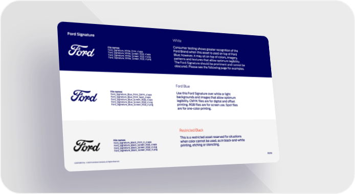 Ford Blue Use this Ford Signature over white or light backgrounds and images that allow optimum legibility. CMYK files are for digital and offset printing. RGB files are for screen use. Spot files are for one-color printing. Restricted Black This is a restricted asset reserved for situations when color cannot be used, as in black-and-white printing, etching or stenciling. File names: Ford_Signature_Blue_Print_CMYK_v1.eps Ford_Signature_Blue_Print_Spot_v1.eps Ford_Signature_Blue_Screen_RGB_v1.eps Ford_Signature_Blue_Screen_RGB_v1.svg Ford_Signature_Blue_Screen_RGB_v1.png File names: Ford_Signature_Black_Print_K_v1.eps Ford_Signature_Black_Screen_RGB_v1.eps Ford_Signature_Black_Screen_RGB_v1.svg Ford_Signature_Black_Screen_RGB_v1.png White Consumer testing shows greater recognition of the Ford Brand when this asset is used on top of Ford Blue; however, it may sit on top of colors, imagery, patterns and textures that allow optimum legibility. The Ford Signature should be prominent and cannot be obscured. Please see the following page for examples. File names: Ford_Signature_White_Print_v1.eps Ford_Signature_White_Screen_RGB_v1.eps Ford_Signature_White_Screen_RGB_v1.svg Ford_Signature_White_Screen_RGB_v1.png Ford Signature Home CONFIDENTIAL © 2021 Ford Motor Company. All Rights Reserved. DRAFT 05 DRAFT 05