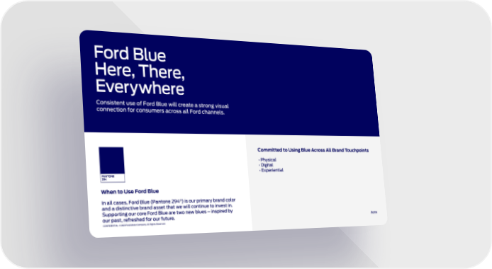 PANTONE 294 Committed to Using Blue Across All Brand Touchpoints • Physical • Digital • Experiential When to Use Ford Blue In all cases, Ford Blue (Pantone 294 ® ) is our primary brand color and a distinctive brand asset that we will continue to invest in. Supporting our core Ford Blue are two new blues – inspired by our past, refreshed for our future. Ford Blue Here, There, Everywhere Consistent use of Ford Blue will create a strong visual connection for consumers across all Ford channels. CONFIDENTIAL © 2021 Ford Motor Company. All Rights Reserved. Home DRAFT 05 DRAFT 05