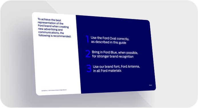 Use the Ford Oval correctly, as described in this guide Bring in Ford Blue, when possible, for stronger brand recognition Use our brand font, Ford Antenna, in all Ford materials To achieve the best representation of the Ford brand when creating new advertising and communications, the following is recommended: 1 2 3 CONFIDENTIAL © 2021 Ford Motor Company. All Rights Reserved. Home DRAFT 05 DRAFT 05