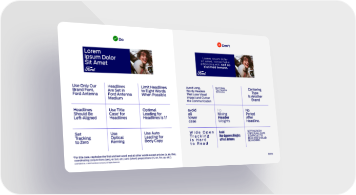 Use Only Our Brand Font, Ford Antenna Headlines Are Set in Ford Antenna Medium Limit Headlines to Eight Words When Possible Headlines Should Be Left-Aligned Use Title Case * for Headlines Optimal Leading for Headlines Is 1:1 Use Auto Leading for Body Copy Set Tr a c k i n g to Zero Use Optical Kerning * For title case, capitalize the first and last word, and all other words except articles (a, an, the), coordinating conjunctions (and, or, but, etc.) and (short) prepositions (in, on, for, up, etc.). Lorem Ipsum Dolor Sit Amet Lorem ipsum dolor sit amet, consectetur adipiscing elit, sed do eiusmod tempor. Avoid Long, Wordy Headers That Lose Visual Impact and Clutter the Communication Don’t Make Your Headline Diminutive Centering Ty p e Is Another Brand avoid all lower case No Mixing Header Weights No Period After Headline. SETTING BODY COPY IN ALL CAPS IS DIFFICULT TO READ AND SHOULD B E AVO I D E D . W i d e O p e n T r a c k i n g Is Hard to Read Avoid Non-Approved Weights of Ford Antenna Do Don’t Home CONFIDENTIAL © 2021 Ford Motor Company. All Rights Reserved. DRAFT 05 DRAFT 05