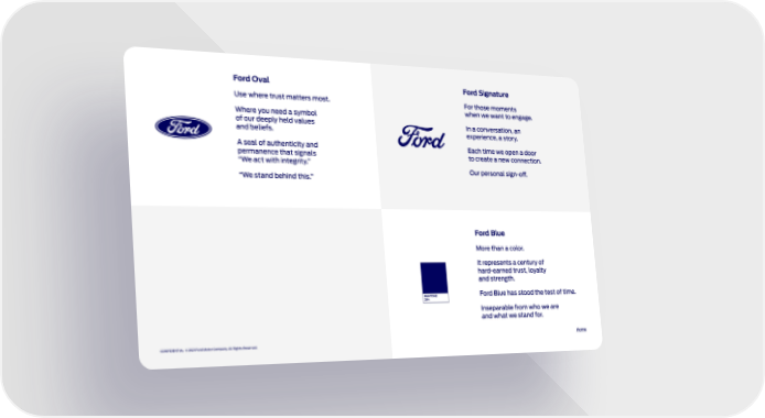 PANTONE 294 Ford Signature For those moments when we want to engage. In a conversation, an experience, a story. Each time we open a door to create a new connection. Our personal sign-off. Ford Oval Use where trust matters most. Where you need a symbol of our deeply held values and beliefs. A seal of authenticity and permanence that signals “We act with integrity.” “We stand behind this.” Ford Blue More than a color. It represents a century of hard-earned trust, loyalty and strength. Ford Blue has stood the test of time. Inseparable from who we are and what we stand for. Home CONFIDENTIAL © 2021 Ford Motor Company. All Rights Reserved. DRAFT 05 DRAFT 05