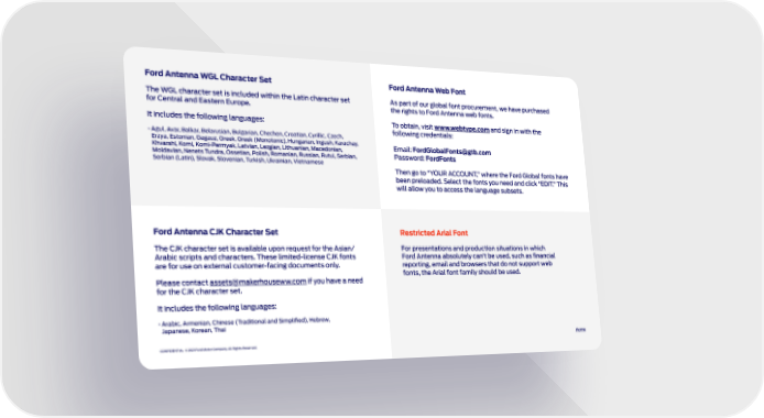 Ford Antenna CJK Character Set The CJK character set is available upon request for the Asian/ Arabic scripts and characters. These limited-license CJK fonts are for use on external customer-facing documents only. Please contact assets@makerhouseww.com if you have a need for the CJK character set. It includes the following languages: • Arabic, Armenian, Chinese (Traditional and Simplified), Hebrew, Japanese, Korean, Thai Restricted Arial Font For presentations and production situations in which Ford Antenna absolutely can’t be used, such as financial reporting, email and browsers that do not support web fonts, the Arial font family should be used. Ford Antenna Web Font As part of our global font procurement, we have purchased the rights to Ford Antenna web fonts. To obtain, visit www.webtype.com and sign in with the following credentials: Email: FordGlobalFonts@gtb.com Password: FordFonts Then go to “YOUR ACCOUNT,” where the Ford Global fonts have been preloaded. Select the fonts you need and click “EDIT.” This will allow you to access the language subsets. Ford Antenna WGL Character Set The WGL character set is included within the Latin character set for Central and Eastern Europe. It includes the following languages: • Agul, Avar, Balkar, Belarusian, Bulgarian, Chechen, Croatian, Cyrillic, Czech, Erzya, Estonian, Gagauz, Greek, Greek (Monotonic), Hungarian, Ingush, Karachay, Khvarshi, Komi, Komi-Permyak, Latvian, Lezgian, Lithuanian, Macedonian, Moldavian, Nenets Tundra, Ossetian, Polish, Romanian, Russian, Rutul, Serbian, Serbian (Latin), Slovak, Slovenian, Turkish, Ukrainian, Vietnamese Home CONFIDENTIAL © 2021 Ford Motor Company. All Rights Reserved. DRAFT 05 DRAFT 05