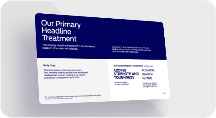 Body Copy This is the primary body copy treatment. Ford Antenna Medium, mixed case, left-aligned. * Leading is set to auto. Tracking is set to zero. Use optical kerning where applicable. * For countries reading right to left, primary treatment is right-aligned, not left-aligned. Accessible Headline for Web Ford Antenna Medium, title case, left-aligned, * 1.5 height line spacing ADDING STRENGTH AND TOUGHNESS Ford Antenna Bold, all caps, left-aligned * Our Primary Headline Treatment The primary headline treatment is Ford Antenna Medium, title case, left-aligned. * Alternative Headline Treatments Limited Usage Leading is 1:1, so if your headline is set at 96, your leading will also be 96. Tracking is set to zero. Use optical kerning where applicable. Home CONFIDENTIAL © 2021 Ford Motor Company. All Rights Reserved. DRAFT 05 DRAFT 05
