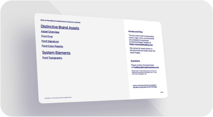 Click on the table of contents text to jump to a section. Distinctive Brand Assets Asset Overview Ford Oval Ford Signature Ford Color Palette System Elements Ford Typography Access and Files This document and corresponding assets, logos, fonts and templates are available for download on the Ford Dealer Toolbox at https://www.fdaftoolbox.com . File names for assets shown in this document are listed under the asset images. Questions Please contact the brand team at FordBrand@makerhouseww.com . Please note: FordBrand@makerhouseww.com replaces the previous Ford Global Look + Style email inbox (gls@gtb.com). Click on the Home link from any page in this deck to jump back to this TOC page. Home CONFIDENTIAL © 2021 Ford Motor Company. All Rights Reserved. DRAFT 05 DRAFT 05