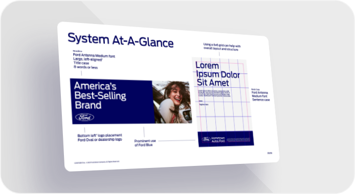America’s Best-Selling Brand Headline Ford Antenna Medium font Large, left-aligned * Title case 8 words or less Using a 6x6 grid can help with overall layout and structure Bottom left * logo placement Ford Oval or dealership logo Body Copy Ford Antenna Medium font Sentence case Prominent use of Ford Blue System At-A-Glance Lorem ipsum dolor sit amet, consectetur adip iscing elit. Duis auctor hendrerit ligula. Proin in rutrum leo. Sed maximus arcu et laoreet male suada. Vestibulum tempor gravida malesuada. Tagline Here Lorem ipsum dolor sit amet, consectetur adipiscing elit. Duis auctor hendrerit ligula. Proin in rutrum leo. Sed maximus arcu et laoreet malesuada. Vestibulum tempor gravida malesuada. Aliquam maximus tortor purus, non venenatis nisi volutpat id. Cras enim est, ullamcorper quis cursus non, pharetra quis velit. Lorem Ipsum Dolor Sit Amet Hometown Autos Ford Home CONFIDENTIAL © 2021 Ford Motor Company. All Rights Reserved. DRAFT 05 DRAFT 05