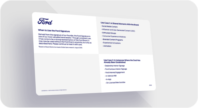 Use Case 1: In Shared Moments With the Brand • Social Media Content • Influencer and User-Generated Content (UGC) • Enthusiast Groups • Consumer Experience Initiatives • Branded Content Programs • Experiential Activations • Animation Use Case 2: In Instances Where the Oval Has Already Been Established • Dealership Interior Signage • Ford Campus Interior Signage • Ford Internal Engagement • In-Vehicle HMI • In-App • On Licensed Merchandise When to Use the Ford Signature Derived from the signature of our founder, the Ford Signature is one of our most valuable brand assets. * Through consistent use, it has come to be a strong representation of the Ford Brand. It may now be used without the Ford Oval in proximity, but only as described here. Please continue to treat it with care. * Based on Brand Distinctive Assets Global Ipsos research, August 2020. Home CONFIDENTIAL © 2021 Ford Motor Company. All Rights Reserved. DRAFT 05 DRAFT 05