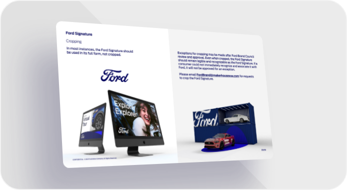 Ford Signature Cropping In most instances, the Ford Signature should be used in its full form, not cropped. Exceptions for cropping may be made after Ford Brand Council review and approval. Even when cropped, the Ford Signature should remain legible and recognizable as the Ford Signature. If a consumer could not immediately recognize and associate it with Ford, it will not be approved for an exception. Please email [email protected] for requests to crop the Ford Signature. Home CONFIDENTIAL © 2021 Ford Motor Company. All Rights Reserved. DRAFT 05 DRAFT 05