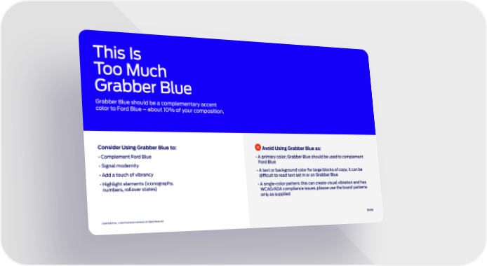 Avoid Using Grabber Blue as: • A primary color; Grabber Blue should be used to complement Ford Blue • A text or background color for large blocks of copy; it can be difficult to read text set in or on Grabber Blue • A single-color pattern; this can create visual vibration and has WCAG/ADA compliance issues; please use the brand patterns only as supplied Consider Using Grabber Blue to: • Complement Ford Blue • Signal modernity • Add a touch of vibrancy • Highlight elements (iconography, numbers, rollover states) This Is To o M u c h Grabber Blue Grabber Blue should be a complementary accent color to Ford Blue – about 10% of your composition. Home CONFIDENTIAL © 2021 Ford Motor Company. All Rights Reserved. DRAFT 05 DRAFT 05