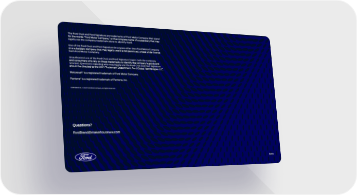 The Ford Oval and Ford Signature are trademarks of Ford Motor Company that stand for the words “Ford Motor Company,” or the complete name of a subsidiary that may legally use the company trademark alone to identify itself. Use of the Ford Oval and Ford Signature by anyone other than Ford Motor Company or a subsidiary company that may legally use it is not permitted, unless under license from Ford Motor Company. Unauthorized use of the Ford Oval and Ford Signature harms both the company and consumers who rely on these trademarks to identify the company’s goods and services. Questions regarding who may legally use the Ford Oval and Ford Signature should be directed to the OGC/Trademark Department, Ford Global Technologies LLC. Motorcraft ® is a registered trademark of Ford Motor Company. Pantone ® is a registered trademark of Pantone, Inc. CONFIDENTIAL © 2021 Ford Motor Company. All Rights Reserved. Questions? FordBrand@makerhouseww.com Home DRAFT 05 DRAFT 05