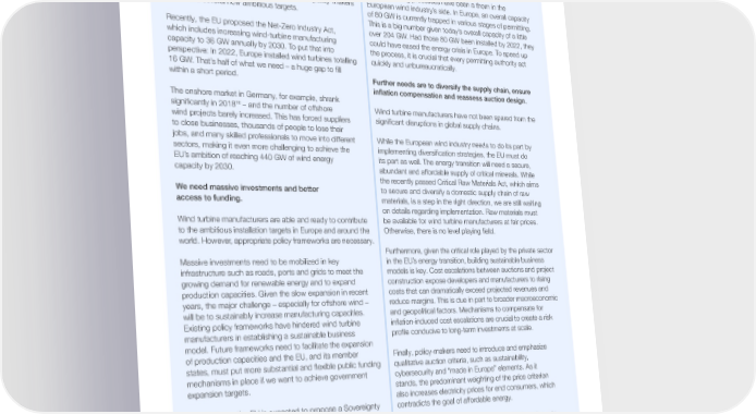 GUEST PERSPECTIVE Europe needs more wind now. And we need it fast. By Jochen Eickholt, Chief Executive Of昀椀cer, Siemens Gamesa Renewable Energy After decades of small steps, the EU and other parts of the We need to cut through the red tape. world – most notably the US – now seem to be serious about transforming energy systems. This is especially clear in the Slow permitting processes have been a thorn in the case of wind energy, where over the past year policy-makers European wind industry’s side. In Europe, an overall capacity introduced several new ambitious targets. of 80 GW is currently trapped in various stages of permitting. This is a big number given today’s overall capacity of a little Recently, the EU proposed the Net-Zero Industry Act, over 204 GW. Had those 80 GW been installed by 2022, they which includes increasing wind-turbine manufacturing could have eased the energy crisis in Europe. To speed up capacity to 36 GW annually by 2030. To put that into the process, it is crucial that every permitting authority act perspective: In 2022, Europe installed wind turbines totalling quickly and unbureaucratically. 16 GW. That’s half of what we need – a huge gap to 昀椀ll within a short period. Further needs are to diversify the supply chain, ensure in昀氀ation compensation and reassess auction design. The onshore market in Germany, for example, shrank 16 signi昀椀cantly in 2018 – and the number of offshore Wind turbine manufacturers have not been spared from the wind projects barely increased. This has forced suppliers signi昀椀cant disruptions in global supply chains. to close businesses, thousands of people to lose their jobs, and many skilled professionals to move into different While the European wind industry needs to do its part by sectors, making it even more challenging to achieve the implementing diversi昀椀cation strategies, the EU must do EU’s ambition of reaching 440 GW of wind energy its part as well. The energy transition will need a secure, capacity by 2030. abundant and affordable supply of critical minerals. While the recently passed Critical Raw Materials Act, which aims We need massive investments and better to secure and diversify a domestic supply chain of raw access to funding. materials, is a step in the right direction, we are still waiting on details regarding implementation. Raw materials must Wind turbine manufacturers are able and ready to contribute be available for wind turbine manufacturers at fair prices. to the ambitious installation targets in Europe and around the Otherwise, there is no level playing 昀椀eld. world. However, appropriate policy frameworks are necessary. Furthermore, given the critical role played by the private sector Massive investments need to be mobilized in key in the EU’s energy transition, building sustainable business infrastructure such as roads, ports and grids to meet the models is key. Cost escalations between auctions and project growing demand for renewable energy and to expand construction expose developers and manufacturers to rising production capacities. Given the slow expansion in recent costs that can dramatically exceed projected revenues and years, the major challenge – especially for offshore wind – reduce margins. This is due in part to broader macroeconomic will be to sustainably increase manufacturing capacities. and geopolitical factors. Mechanisms to compensate for Existing policy frameworks have hindered wind turbine in昀氀ation-induced cost escalations are crucial to create a risk manufacturers in establishing a sustainable business pro昀椀le conducive to long-term investments at scale. model. Future frameworks need to facilitate the expansion of production capacities and the EU, and its member Finally, policy-makers need to introduce and emphasize states, must put more substantial and 昀氀exible public funding qualitative auction criteria, such as sustainability, mechanisms in place if we want to achieve government cybersecurity and “made in Europe” elements. As it expansion targets. stands, the predominant weighting of the price criterion also increases electricity prices for end consumers, which This summer, the EU is expected to propose a Sovereignty contradicts the goal of affordable energy. Fund. It remains to be seen whether it will provide an approach as pragmatic and clear as that of the US In昀氀ation The goal is clear, and so is the path – now we have to Reduction Act, which mobilizes investment with a preference show we really want it. for domestic green technologies. The EU Innovation Fund, however, which is limited to the funding of technological If we really want energy independence in Europe, we need to breakthroughs and will be in place until the Sovereignty Fund make sure we have a healthy and resilient wind industry. There is established, is not suitable in its current form to support is no question that the wind industry is of enormous strategic accelerated investment in manufacturing capacity. importance. But we need to act fast. We need more wind now. Fostering Effective Energy Transition: 2023 Edition 24